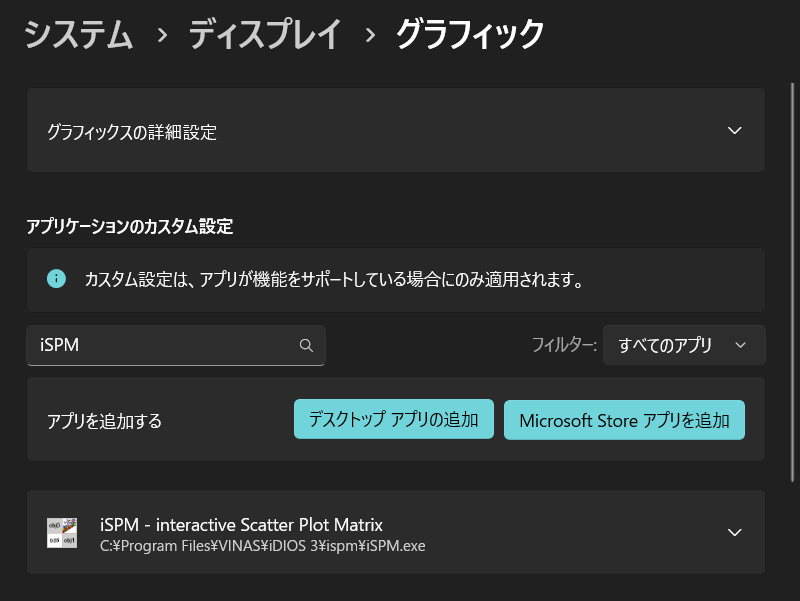 設定¶ iSPM のグラフィックス設定¶ iSPM は OpenGL対応のグラフィックを使用することで、高速に描画ができます。 OpenGLグラフィックカードが搭載されているにもかかわらず、バージョン情報に「OpenGL 2.0 に対応していません。」と表示されている場合は、Windowsの設定で「グラフィックスの詳細設定」をアプリケーションを設定してください。