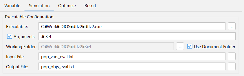 [Executable]に設定した評価プログラムがバッチファイル(拡張子 bat)または PowerShellスクリプト(拡張子 ps1)の場合は、プログラムへの引数に設計変数が設定されます。